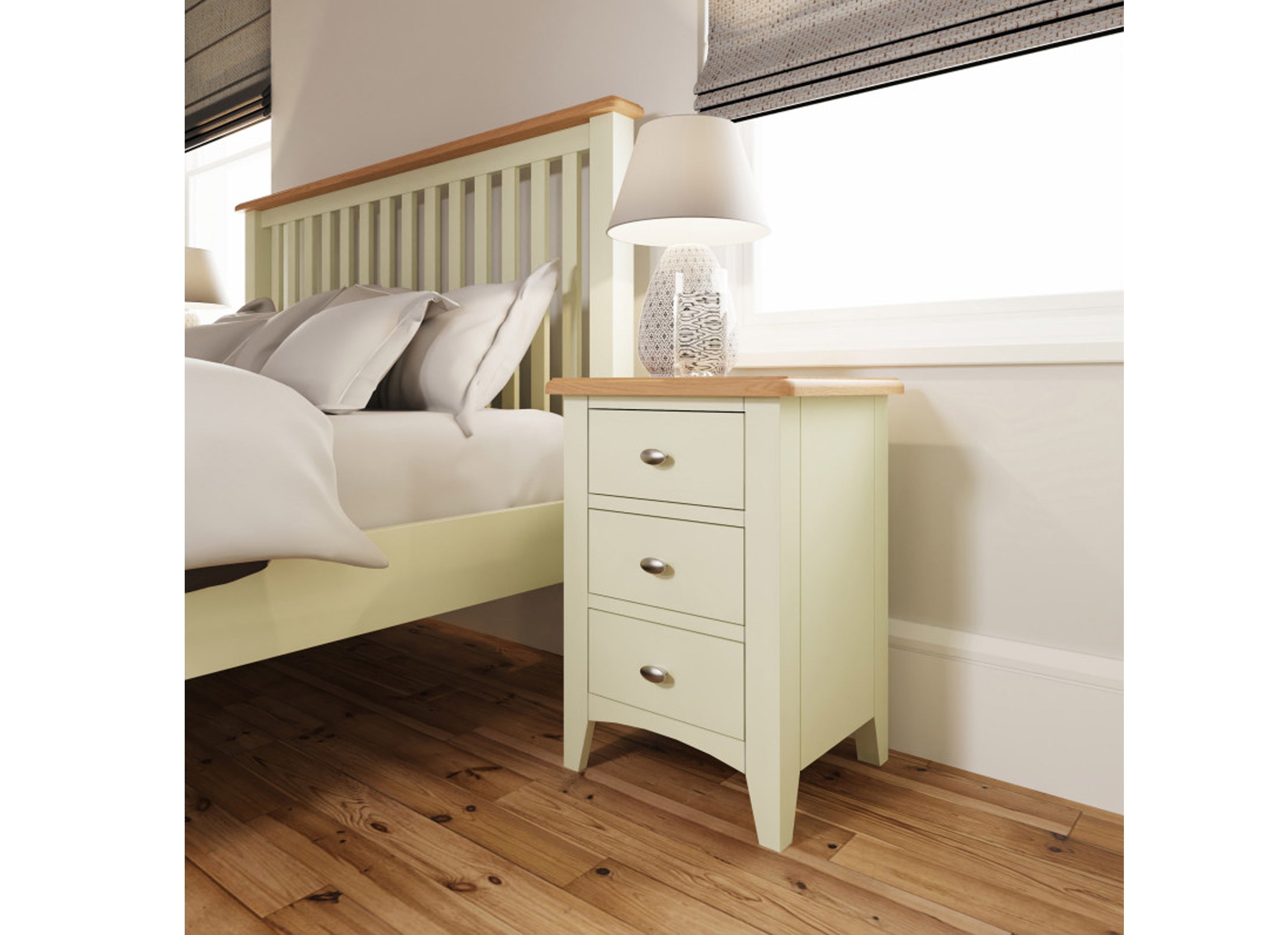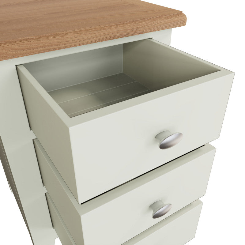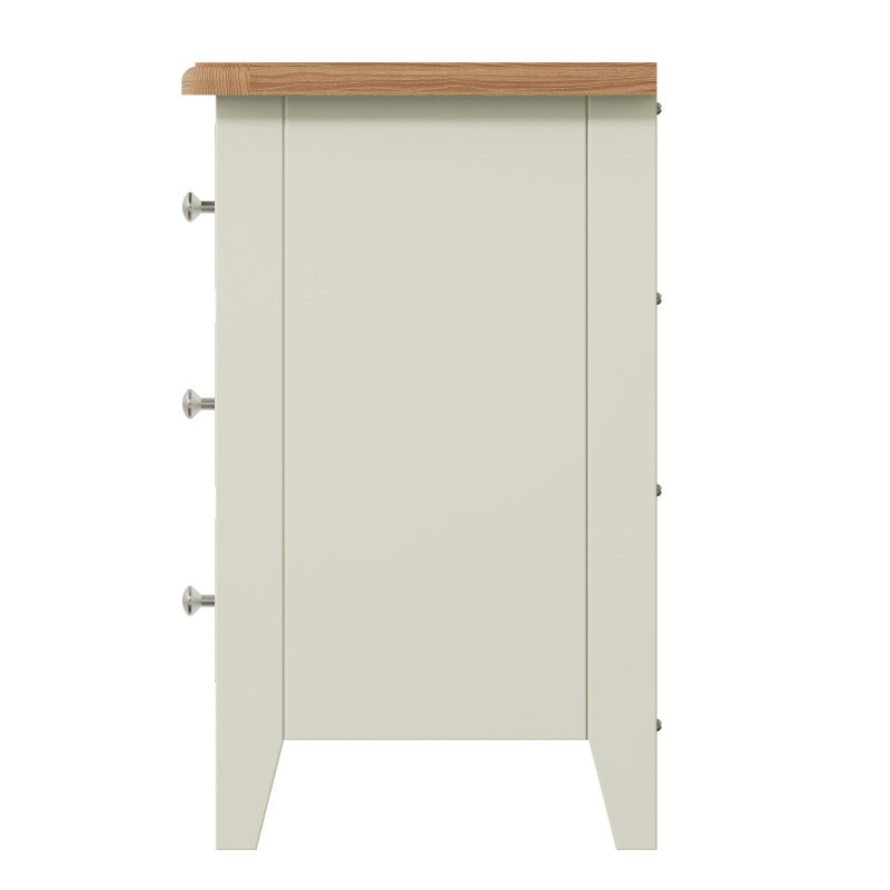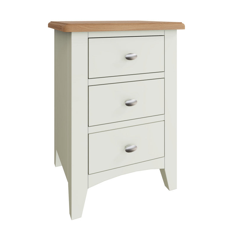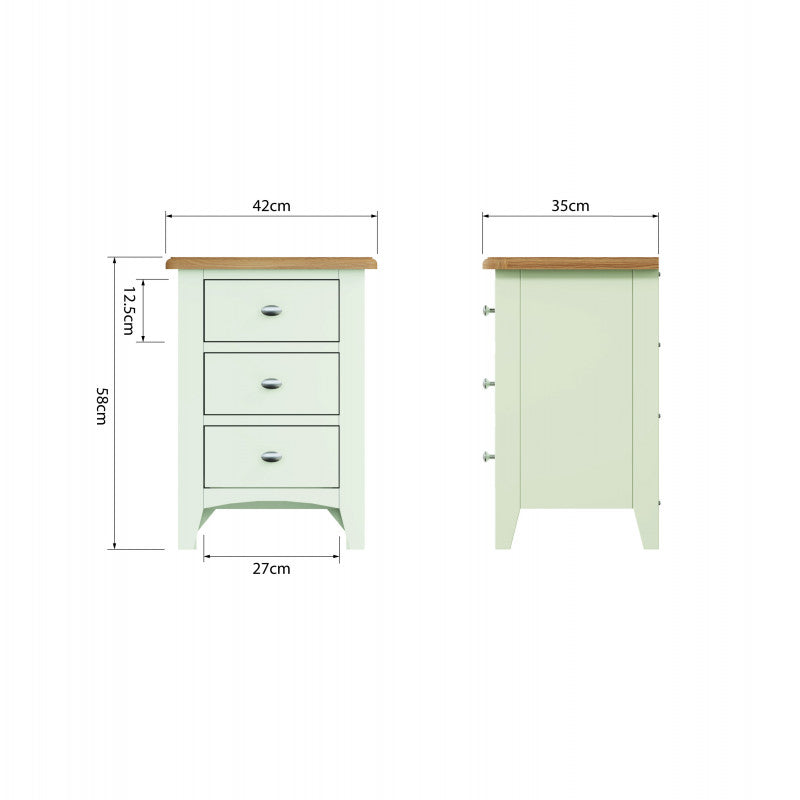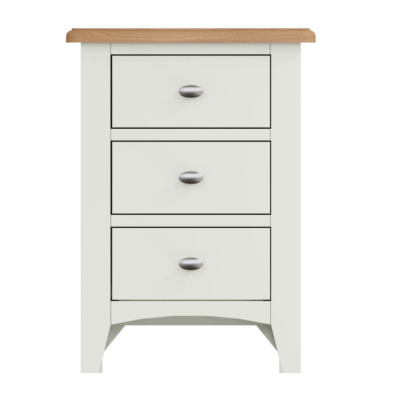 DIMENSIONS: 580(H) x 420(W) x 350(D).COLOUR: Ivory White / Light Oak (2 TONE).MATERIAL: Hardwood Oak / Oak veneer / custom-wood combination.FEATURES:- Chrome handles.- 3 Drawers.ORIGIN: Imported.GUARANTEE: 12 month manufacturer's warranty. PACKAGING: Fully assembled.CLEANING: Wipe clean with a damp/dry cloth.
