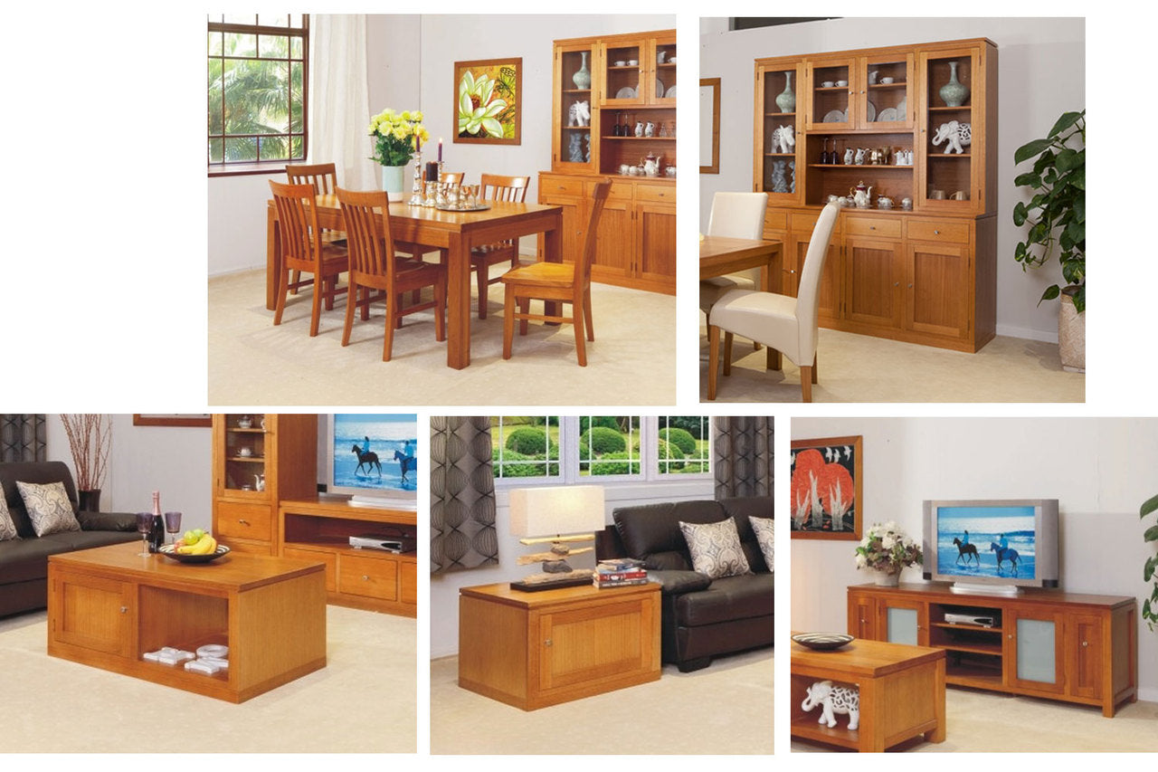 COLOUR: Choose from above available colours. SET CONSISTS OF: 1 x 1800 dining table ; 6 x dining chairs ; 1 x Joe Sun TV Unit ; 1 x coffee table ; 1 x lamp table ; 1 x buffet & hutch. DIMENSIONS: Table - 760(H) X 1800(L) X 1000(W) / TV Unit - 650(H) X 2000(W) X 500(D) / Coffee Table - 500(H) X 1200(W) X 700(D) / Lamp Table - 500(H) X 700(W) X 500(D) / Buffet & Hutch - 2035(H) x 1870(W) x 500(D). MATERIAL: Hardwood Tasmanian Oak / Tassie Oak Veneer Combination. FEATURES: ORIGIN: Imported. GUARANTEE: 1 year manufacturer's warranty PACKAGING: Fully assembled - cartonised for easy delivery. CLEANING: Wipe clean with a damp/dry cloth.