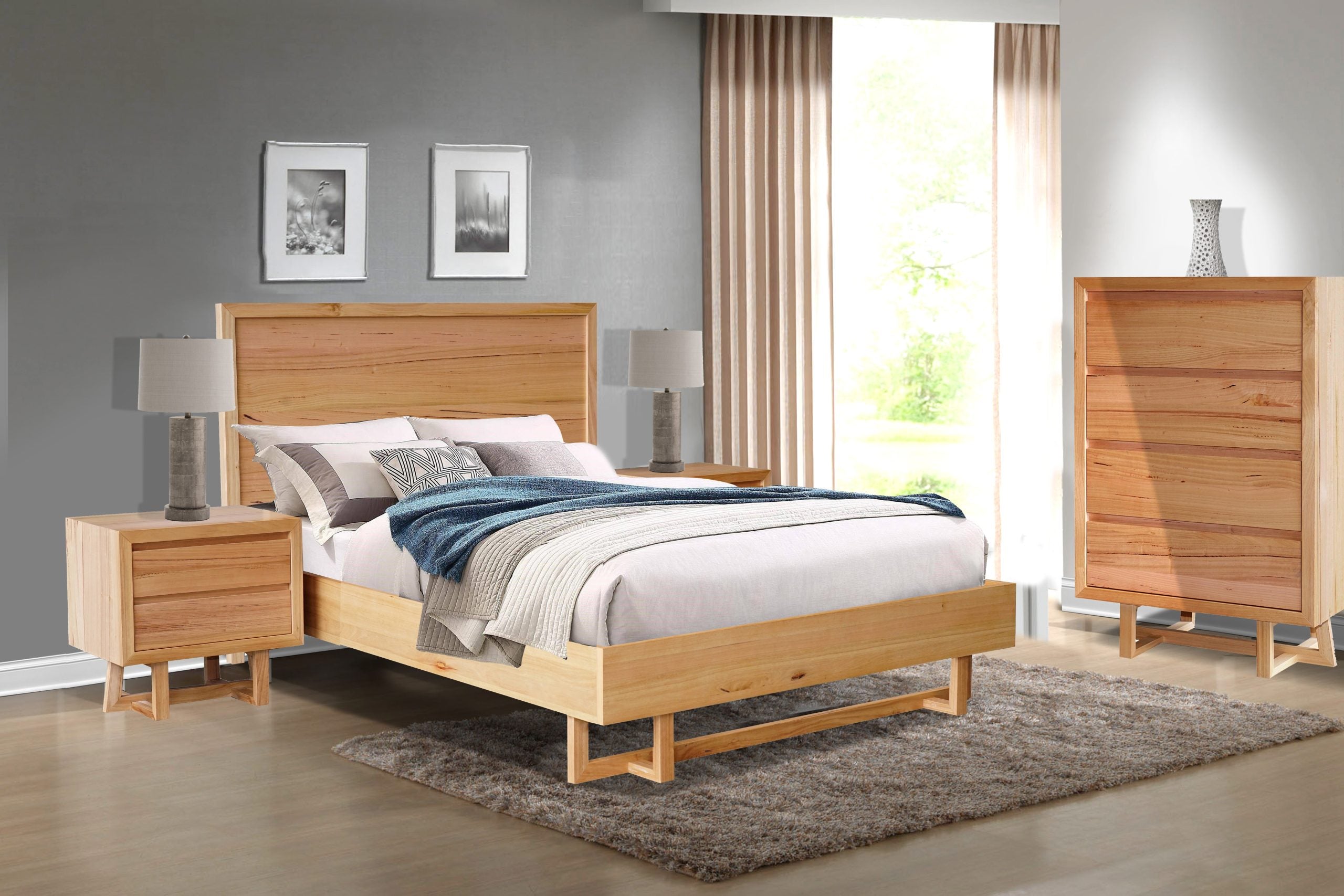 LISTING CONSISTS OF: 1x Bed, 2 x Bedside Table. DIMENSIONS: COLOUR: Messmate.MATERIAL: Solid Timber / custom-wood combination.FEATURES:ORIGIN: Imported.GUARANTEE: 12 month manufacturer's warranty.PACKAGING: Bed is flat-packed for easy assembly - other items are fully assembled.CLEANING: Wipe clean with a damp / dry cloth.