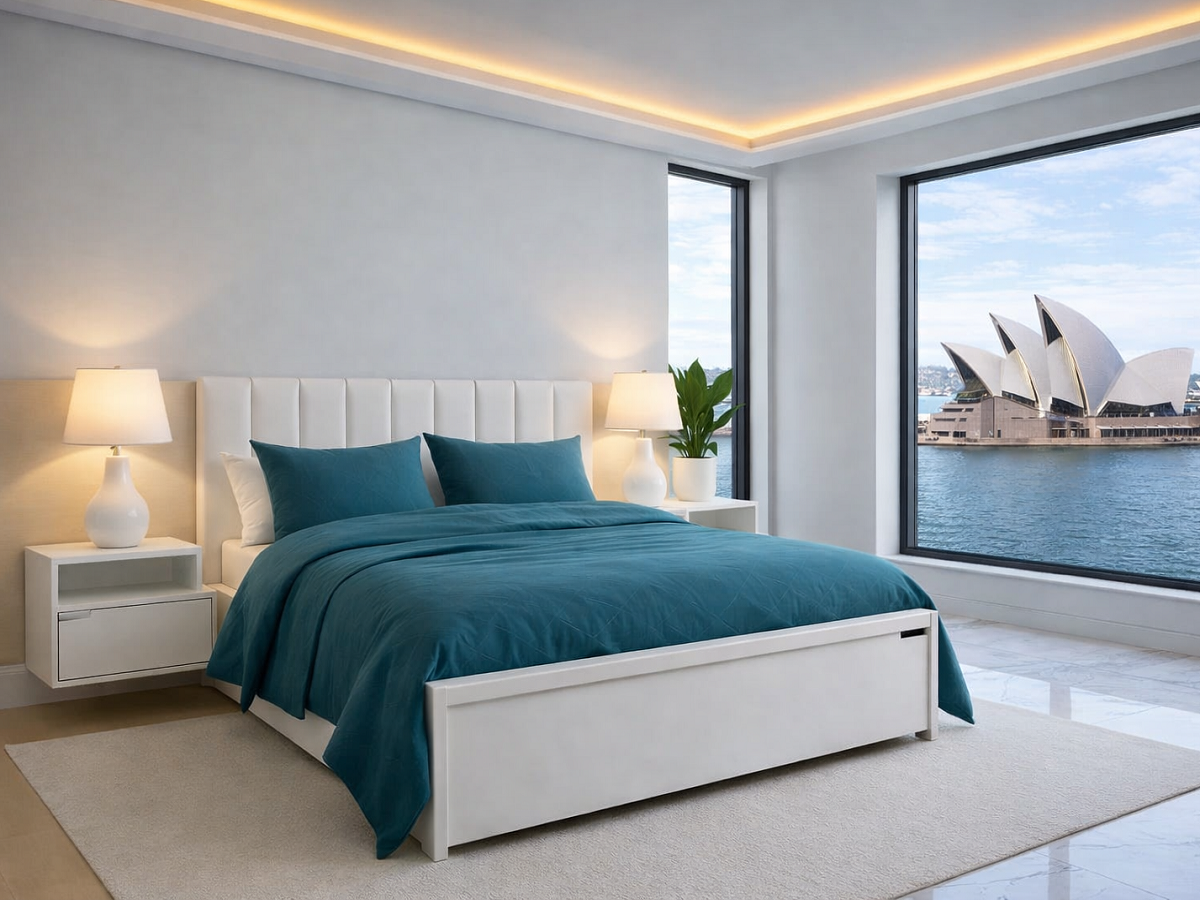 Integrated floating bedside tables with storage drawers for a clean, uncluttered look
