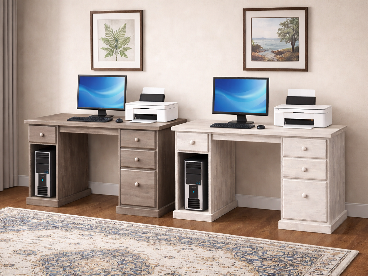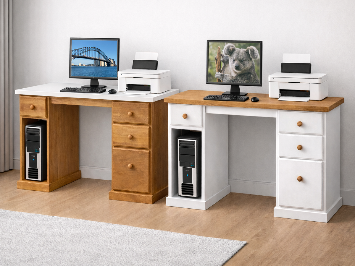 DIMENSIONS/SIZE: 750(H) x 1450(W) x 600(D) or CUSTOM MADE to any size (additional fees may apply). COLOUR: Select from above available colour options. MATERIAL: Solid timber / custom-wood combination. FEATURES: - 3 x drawers. - 1 x small drawer. - 1 x provision for hardrive tower. - 1 x sliding keyboard rack. - Drawers with metal runners. ORIGIN: Made in Australia. GUARANTEE: 12 month manufacturer's warranty. PACKAGING: Fully assembled. CLEANING: Wipe clean with a damp / dry cloth.